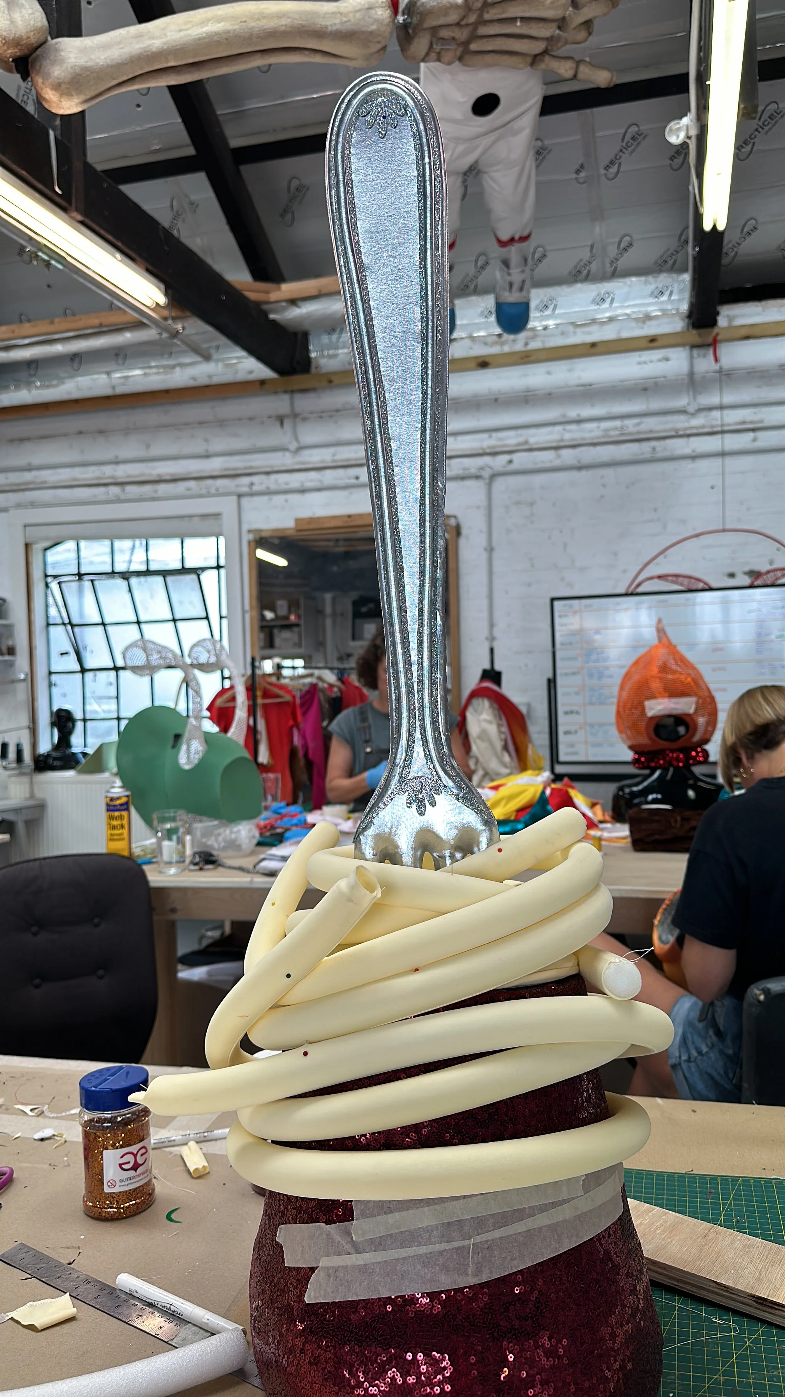 Spaghetti Bolognese has a varaform base head and hoop skirt covered in foam tube covered in lycra. Her fork is made from plastazote with a small aluminium base to keep it stable.